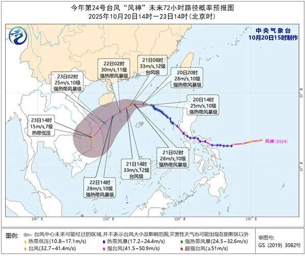 虽然“风神”不会直接登陆我国,但会给华南等地带来明显风雨,尤其是持续性大风。未来三天,它将与冷空气联手,给我国南部和东部海域、华东和华南沿海地区带来持续大风天气,南海中部部分海域有11至12级大风,阵风可达13至14级,其中台湾海峡叠加地形狭管效应,风力可能更大。同时,台湾岛东部和北部、福建沿海、广东沿海、海南岛将有较强降雨,以中到大雨量级为主,台湾岛北部、海南岛东部将遭遇暴雨或大暴雨。