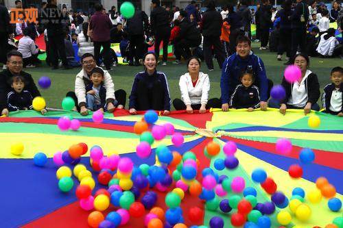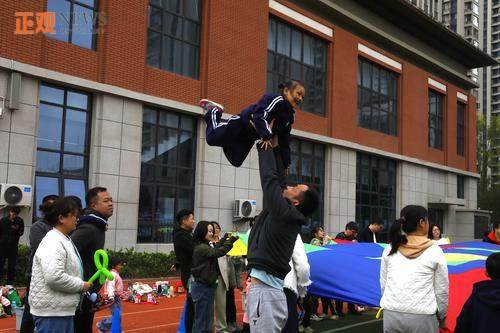 气球伞游戏区更是欢乐的海洋。家长们合力撑起巨型彩虹气球伞,时而上下晃动形成“大小海浪”,孩子们在伞下穿梭奔跑;“旋转木马”环节,家长们转动伞面,孩子跟着节奏跳跃;“抓蝴蝶”“捕鱼”游戏中,家长与孩子分工协作,欢呼声不断。“最佳搭档”“小松鼠接力赛”等竞赛项目,让亲子默契得到充分展现,获胜家庭的欢呼声响彻校园。“飞鱼”“一飞冲天”等气球伞加球游戏,更是让现场氛围持续升温,伞下足球赛中,家长与孩子合力“踢球”,展现出超强协作力。