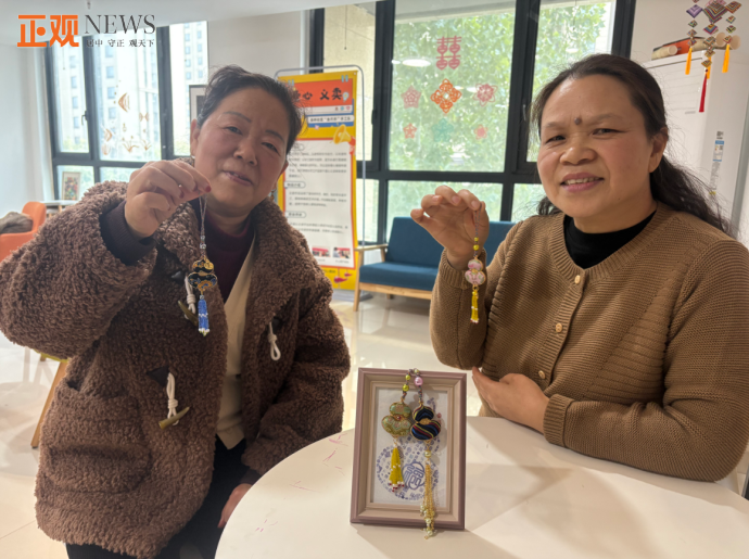 居民围坐桌前,瞬间投入创作:戴着老花镜的张阿姨,仔细穿针引线,不时举着面料向老师请教“边角怎么处理更平整”;大家在流苏配色上大胆创新,将金色珠串与蓝绿色丝线结合,让挂饰更显灵动;还有居民互相交流技巧,“你这个红色宋锦配红珠串真喜庆”“我觉得粉紫纹样搭珍珠坠更温柔”……原本安静的活动室,因手工创作变得既热闹又温馨。居民拿着自己的作品合影,脸上满是成就感。
