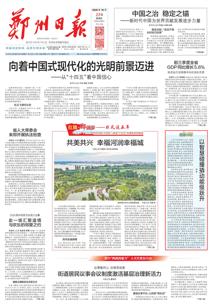 从“文明互鉴”到合作共赢,从节水技术到现代化产业体系,从粮食安全再到新质生产力,多场高规格重大活动接连落地,既是郑州积极对接国家战略的主动作为,也是中国探索高质量发展路径的生动缩影。10月郑州一系列重大活动的“多连奏”,揭示出国家中心城市的进阶逻辑:以区位优势为基座,以国家战略为锚点,以智慧碰撞撬动能级跃升,将资源流量切实转化为发展质量。当文明互鉴的桥梁、智库碰撞的火花与前沿科技的锋芒在此交汇,一系列重大活动集聚和释放的“能量”,必将持续推动超大特大城市转型发展,为奋力谱写中原大地推进中国式现代化新篇章作出新的更大贡献。