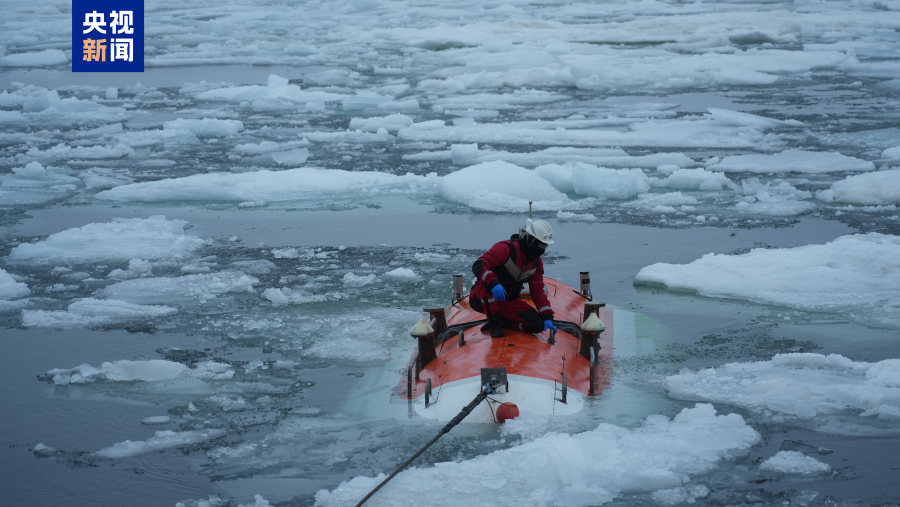△“奋斗者”号在北极密集冰区回收。