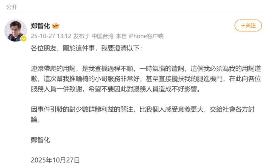 10月27日,郑智化再次发文回应深圳机场事件,并就自己用词不当致歉。这时,又有声音觉得“早该如此”“情绪激动下用词不当难免”。