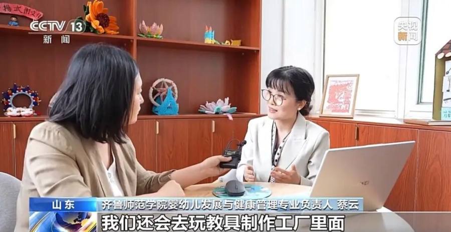 齐鲁师范学院婴幼儿发展与健康管理专业负责人 蔡云:我们每一学期会拿出两周去见习;第七学期、第八学期基本上就是安排实习,让学生去行业企业里面体验,例如托班,我们还会去玩教具制作工厂,(让学生知道)它为什么要这样生产?怎么样从儿童需求出发设计?
