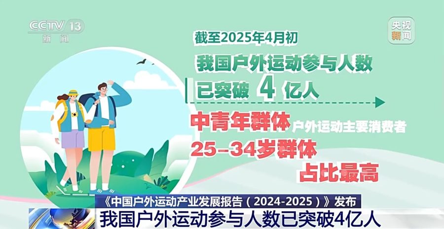 根据报告,截至2025年4月初,我国户外运动参与人数已突破4亿人。中青年群体是户外运动主要消费者,其中25—34岁群体占比最高。从消费项目看,冰雪、山地、水上项目参与度较高。