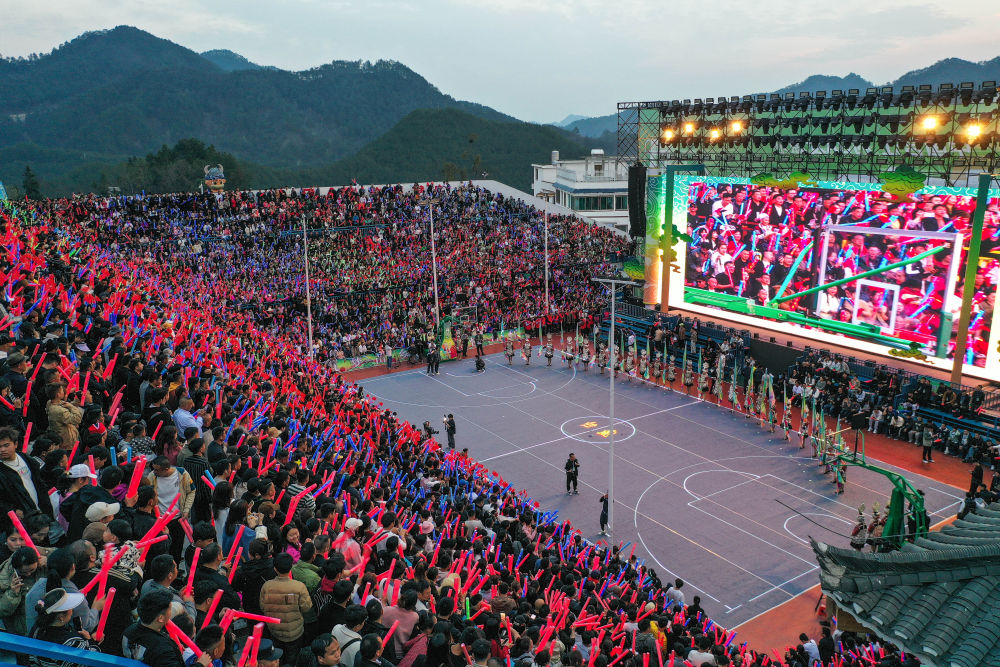 这是2024年3月22日拍摄的2024年乡村篮球球王争霸赛开幕式现场(无人机照片)。当日,以“活力四射 迎‘篮’而上”为主题的2024年乡村篮球球王争霸赛开幕式在贵州省黔东南苗族侗族自治州台江县台盘村举行。本次比赛将从3月持续到11月,是一次跨度长、范围广的全新赛事。新华社记者 杨文斌 摄