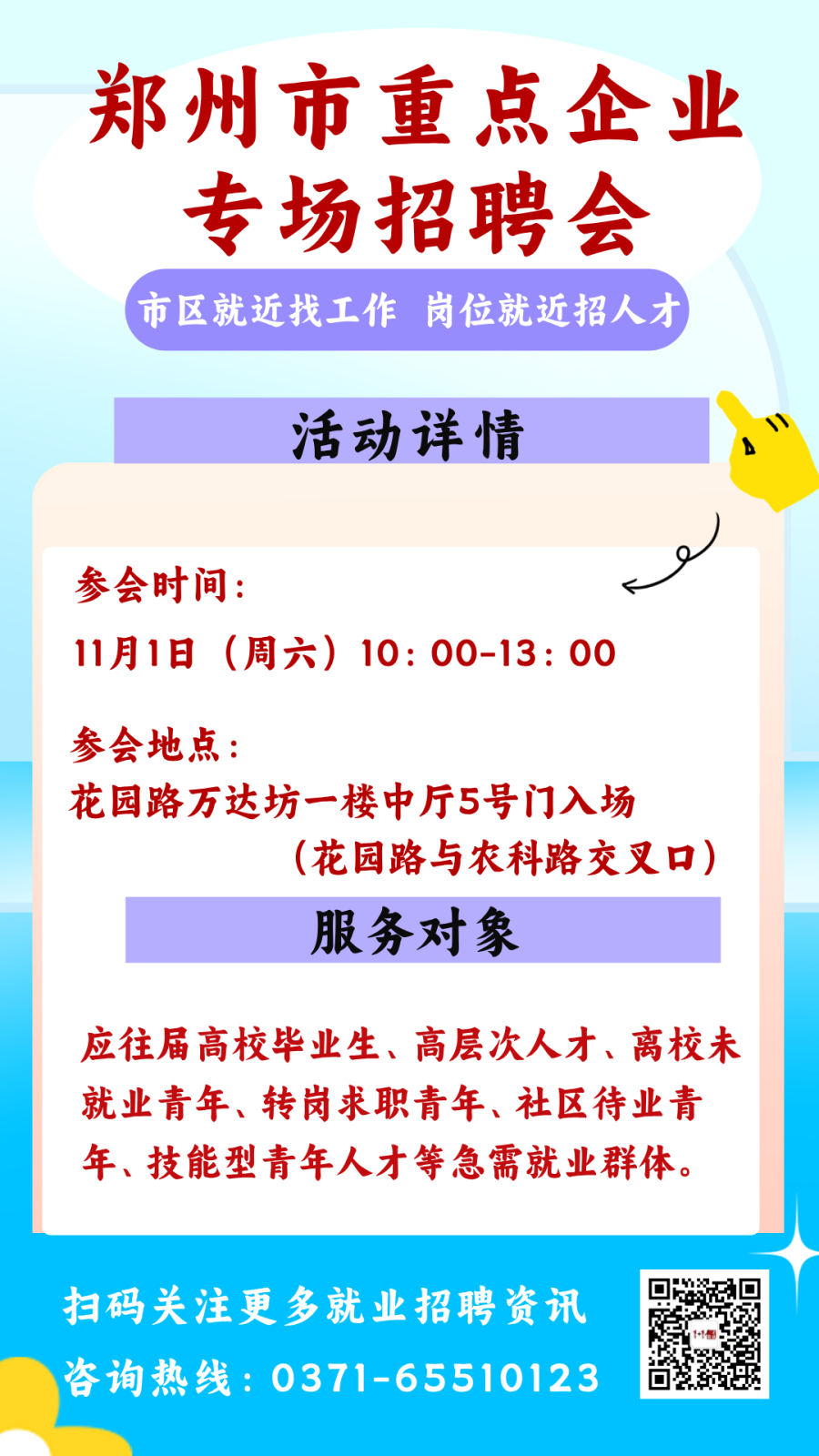 10月28日,记者从郑州市金水区人力资源和社会保障局获悉,11月1日(周六)上午,该局和金水区文化路街道办事处联合河南123人才网,将在花园路万达坊一楼中厅(5号门入场)举办郑州市重点企业专场招聘会活动。