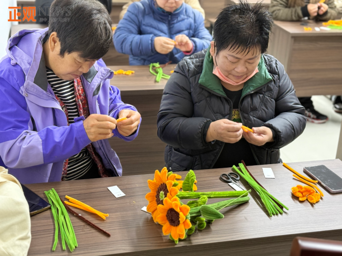 活动现场,学员们围坐桌前,手中的橙色、绿色扭扭棒在指尖翻转缠绕,不一会儿便初具花朵雏形。桌面上摆放着已经完成的向日葵花艺作品,饱满的花瓣、逼真的花茎,尽显手工创意的精致。“以前没接触过手工,这次跟着老师学,发现自己也能做出好看的花。”一位学员拿着刚做好的花瓣,脸上露出了笑意。