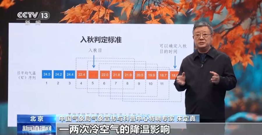 中国气象局气象宣传与科普中心特聘专家 朱定真:为了保证不是受一两次冷空气的降温影响,所以叫5天滑动平均气温。从某一个日期开始,以5天为一周期的滑动,逐渐来测温度,直到低于22度的平均温度出现了5天以上,如果是连续的,那这5天里的第一天就作为入秋日期。
