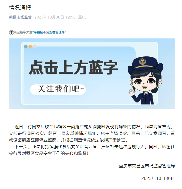 10月30日,重庆市荣昌区市场监督管理局发布情况通报: