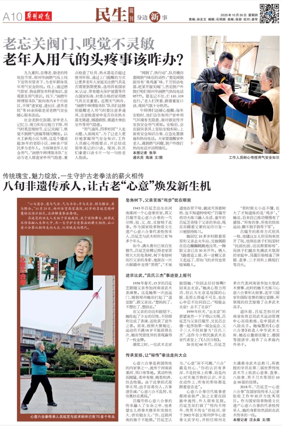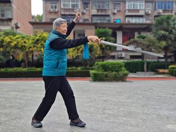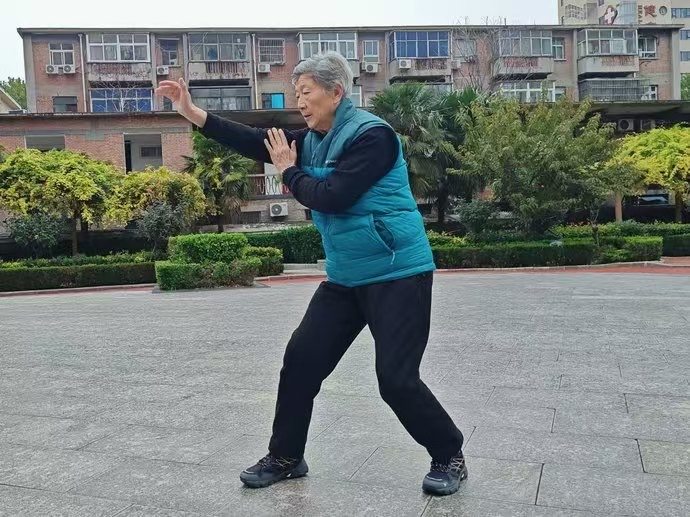 “心与意合、意与气合、气与力合;手与足合、肘与膝合、肩与胯合。”10月29日,郑州体育局家属院,82岁的吕延芝精神矍铄边演示招式,边讲解着拳法要领。