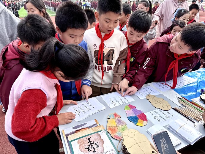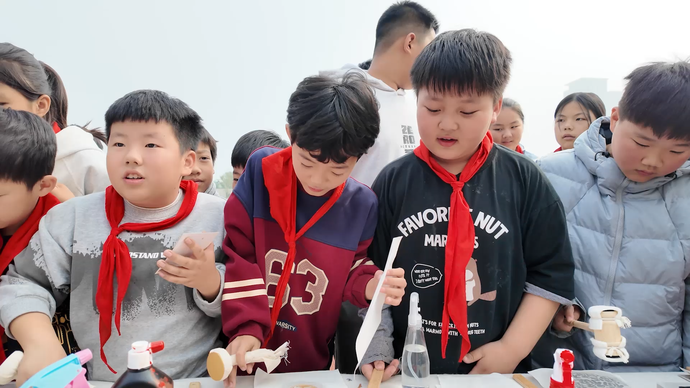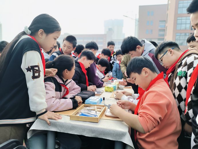 触手生春,非遗入心。在师生的热切期待中,非遗体验环节将整场活动推向高潮。学生们有序走进各非遗体验区,亲身感受传统文化的魅力——从拓片技艺的墨韵留痕,到鸟虫篆的笔走龙蛇;从缠花、绒花的指尖生花,到手工编织的经纬交错;从掐丝珐琅的色彩绚烂,到沉香制作的古香雅韵;从甲骨文文化的千年密码,到果壳铃的巧思妙音......每一项非遗项目都吸引着孩子们专注的目光与跃跃欲试的双手。