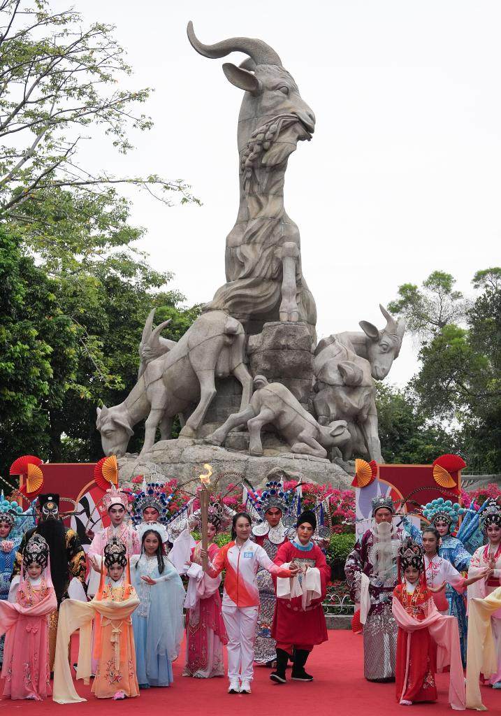 11月2日,火炬手李嘉宜(中)在广州越秀公园内的五羊雕像前传递火炬。当日,中华人民共和国第十五届运动会火炬传递广州站举行。 新华社记者 杜宇 摄