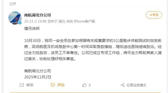 10月30日,我司一安全员在参加根据有关规章要求的3公里跑步体能测试时突发疾病,现场航医及机场急救中心第一时间采取急救措施,随后送往医院继续救治。经过全力抢救后,该员工不幸离世。公司已成立专项工作组,将尽全力帮助其家人渡过难关,协助处理好相关事宜。