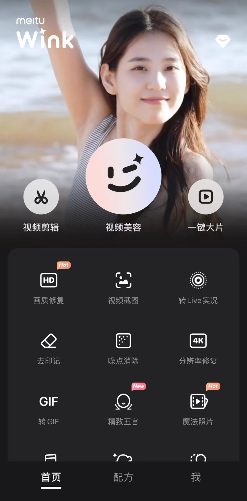 Wink于今年3月底上线,支持“捏脸”、“逆转素颜”、“实况美颜”等功能,目前以“视频分辨率修复”等为主要看点。