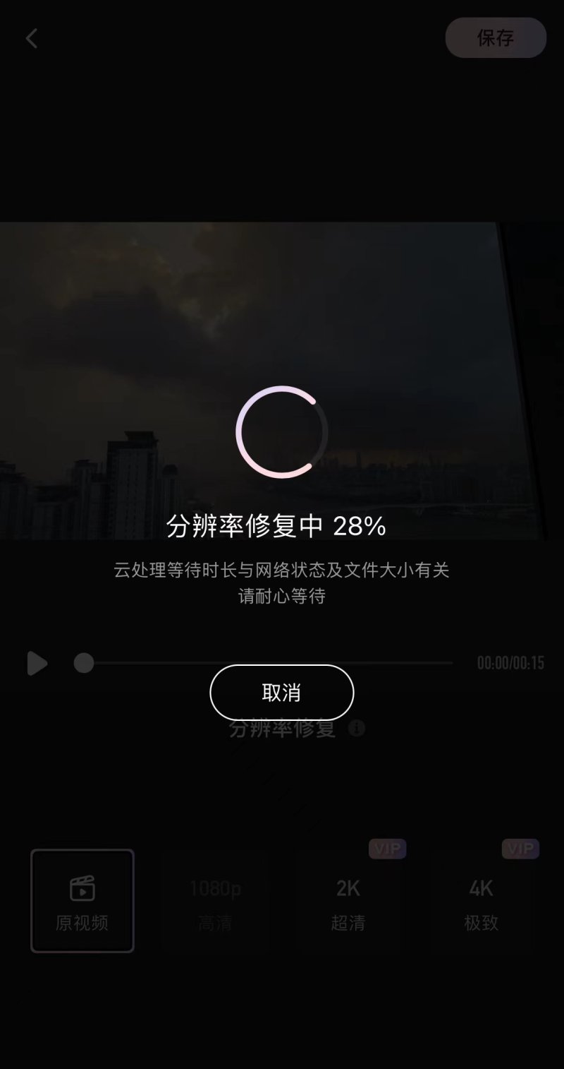 记者尝试用4K修复多段10秒左右的视频,均花费了三分钟左右。在分辨率修复期间,也有提示称,云处理等待时长与网络状态及文件大小有关。