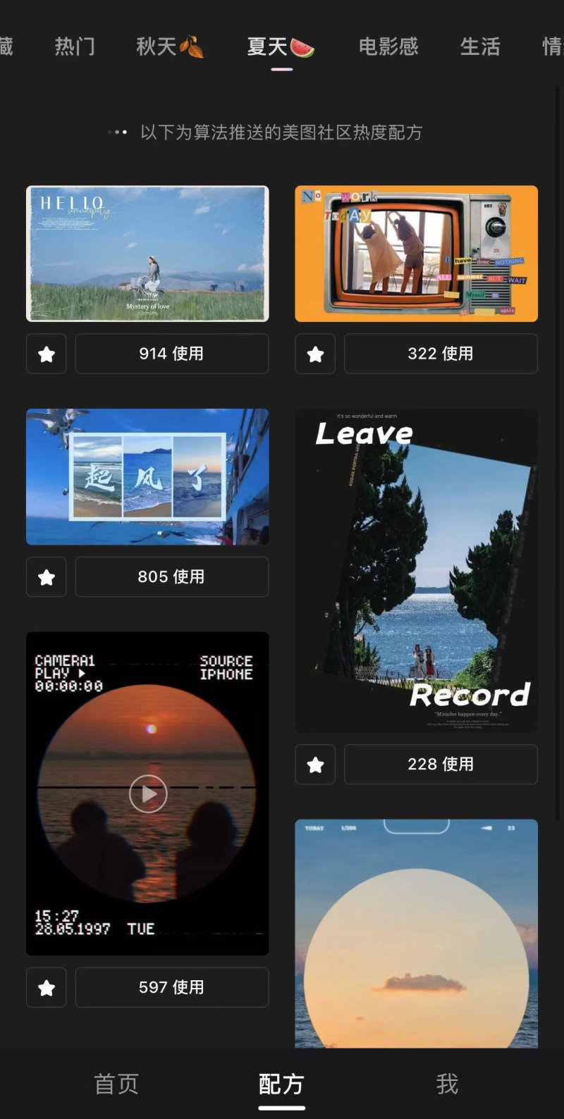 而上述“配方”也有专门的页面供挑选,主要是用户上传的视频模版,使用后可以修改文案和其他效果。这些“配方”都是同步于美图社区。