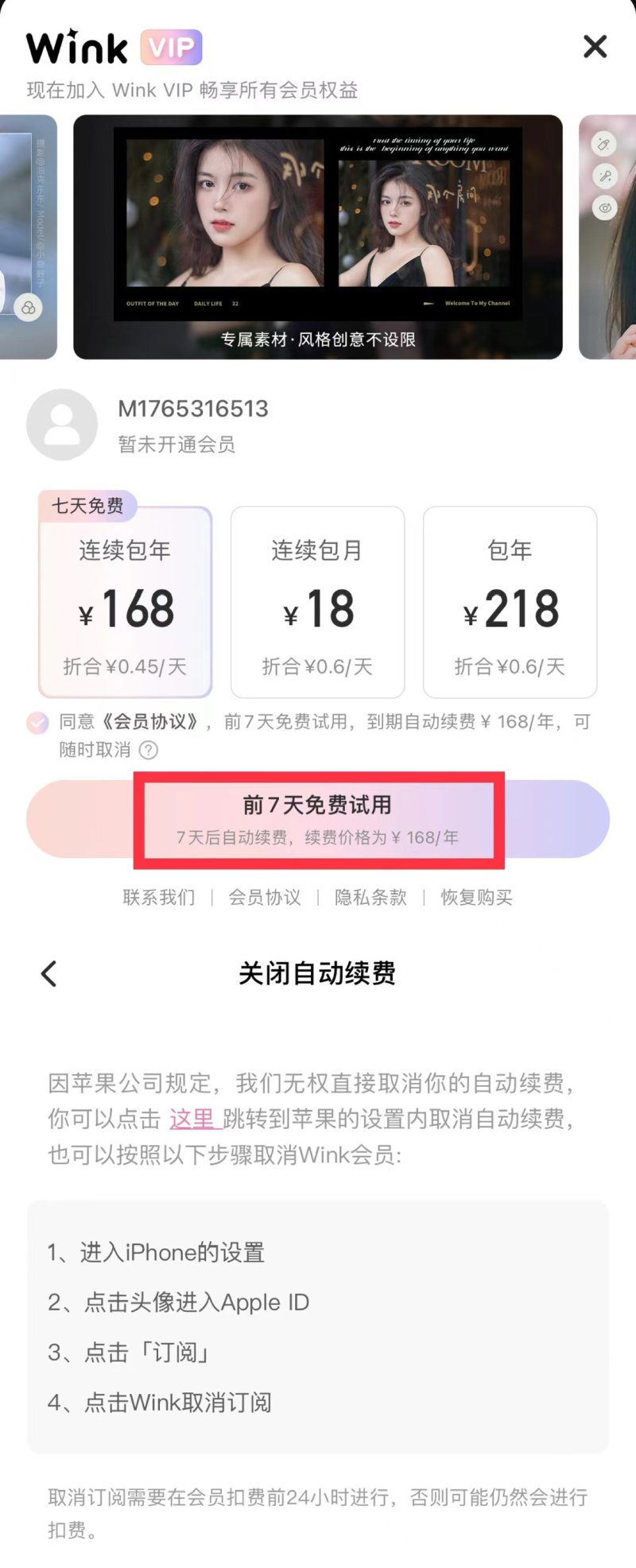 值得一提的是,上述两款软件着重推荐的都是连续包年选项,并为此提供了“七天免费”的优惠。具体而言,若开通连续包年,用户在前7天可免费使用,到期后会自动续费,但也可随时取消。