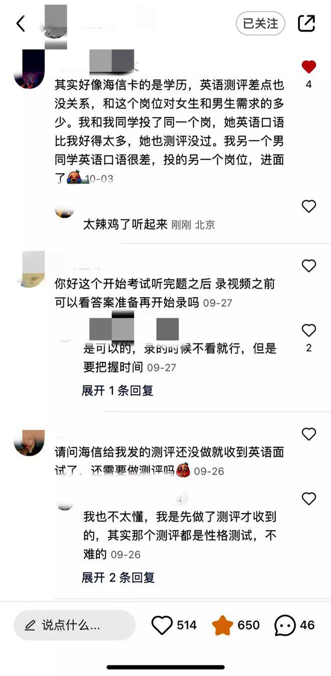 小红书上,有网友在与AI面试相关的帖子中写道,海信公司在AI面试阶段“卡”的好像是学历,还有岗位对男女需求的比例,“我和我的两位同学,一位男生,一位女生,投了同一个岗位。在AI面试的过程中,有涉及到大量的英文回答。我和那位男生的口语水平都不太好,但另一位女生的口语很好。但最终得到的面试结果是,那位男同学就录取了。”