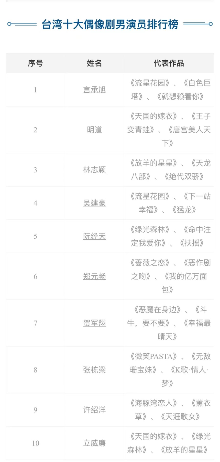 当然,不得不提的不仅仅只有言承旭,有媒体根据电视剧的热度、成绩、评价以及网络关注度等方面的情况整理了一份台湾十大偶像剧男演员名单。