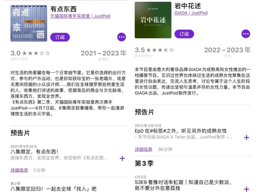 从播客音频内容制作公司来看,它们则更像是播客界的“MCN公司”,出品和孵化了一大批播客节目矩阵,并逐渐摸索出完整的商业化路径。以JustPod为例,它以播客《忽左忽右》为起点,如今旗下拥有11档原创播客节目。而上文提及的天猫国际推出的企业播客《有点东西》和GIADA推出的《岩中花述》,也均是由JustPod制作发行。