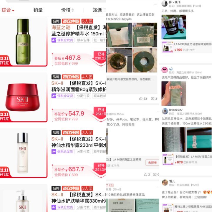在小红书等女性用户居多的社交平台上,Lamer出镜率颇高,作为美妆护肤的天花板,一瓶护肤水动辄千元以上,一瓶30毫升的面霜也要1500元以上。尽管很多女孩子心向往之,但经济实力却不允许。不过,在拼多多,热衷于精致生活的女孩们可以实现lamer自由。