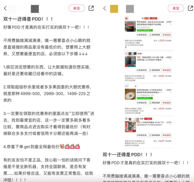 也有拼多多用户在小红书晒出双11采购的家电产品:蒸烤一体、洗碗机、扫地机器人、洗烘一体套装……这些家电,基本都是消费升级的家电产品,拼多多的价格更实惠,消费者可以以更具性价比的价格买到手,实现“理性升级”。