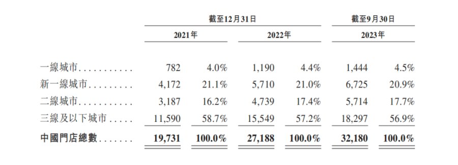 而在跨品类方面,2017年蜜雪冰城推出了咖啡品牌“幸运咖”。蜜雪冰城招股书数据显示,截至2023年9月30日,幸运咖拥有约 2,900家门店;根据灼识咨询的报告,以门店数量计是中国第四大现磨咖啡品牌。