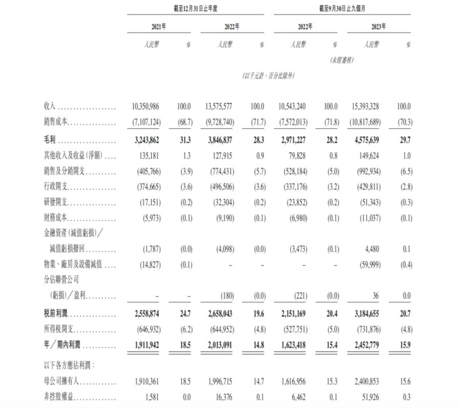 对比同样在冲刺港股的茶百道及古茗,蜜雪冰城的营收与净利润相较更高。2021年,蜜雪冰城、古茗、茶百道分别实现营收103.51亿元、43.84亿元、36.44亿元;同期净利润分别为19.10亿元、7.70亿元(古茗为经调整净利润)、7.79亿元;2022年,蜜雪冰城、古茗、茶百道分别实现营收135.76亿元、55.99亿元、42.32亿元,同期净利润分别为19.97亿元、7.88亿元(古茗为经调整利润)、9.65亿元。