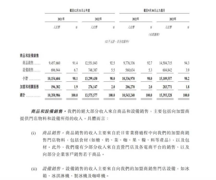 招股书显示,以2023年前9个月为例来看,蜜雪冰城在加盟和相关服务收入方面不到3亿元,占总收入的比重不到2%;向加盟商销售的门店物料和设备销售收入占比在98%左右,高于古茗的80%与茶百道的95%。