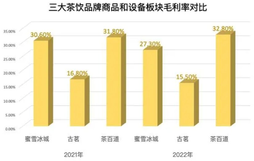 不过,虽然蜜雪冰城建成了行业最成熟的供应链,但是相比起茶百道,其并无太大的成本优势。2021年-2022年,蜜雪冰城在商品和设备销售方面的毛利率分别为30.6%、27.3%,同期茶百道为32.8%、31.8%,古茗则相对较低,同期为16.8%、15.5%。