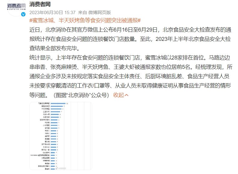 “趣解商业”在黑猫投诉平台搜索“蜜雪冰城”关键词,发现有超6800条相关投诉,其中多数投诉涉及产品标准化问题及商家服务态度问题,还有部分投诉表示在饮品中发现异物;根据北京市消费者协会发布的消息,2023年上半年在北京食品安全大检查中,上半年存在食品安全问题的连锁餐饮门店,蜜雪冰城以28家排在首位。面对食品安全问题,蜜雪冰城也在招股书中披露了该项风险点。