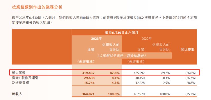 但从整体财报数据来看,乐华娱乐的营收成绩并不算太乐观。2023年中期报告显示,乐华娱乐去年上半年营收为3.64亿元,较上年同期收入下降25.2%;其中,占总收入近九成的艺人管理收入较上年同期下降近三成。针对这块业务营收下滑,乐华解释为“市况不佳,导致对签约艺人所提供服务的需求下降”。
