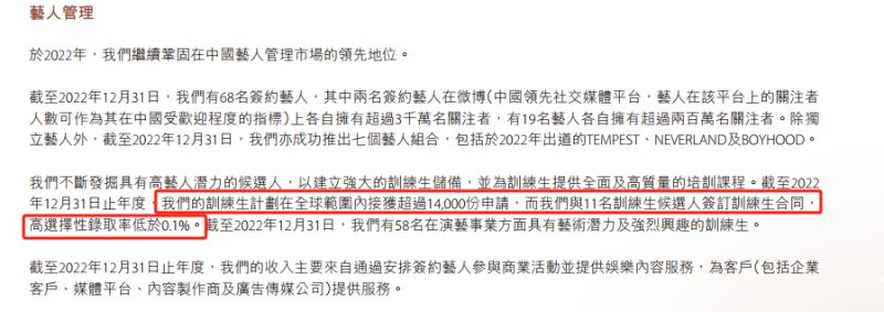 在复制偶像上,乐华可能是国内最有话语权的公司之一。财报显示,2022年乐华娱乐的训练生计划在全球范围内接到超过14000份申请,公司仅与11名训练生候选人签订训练生合同,录取率低于0.1%,而2023年国考的平均录取率为1.4%,从数据上看成为偶像要比考公艰难数倍。