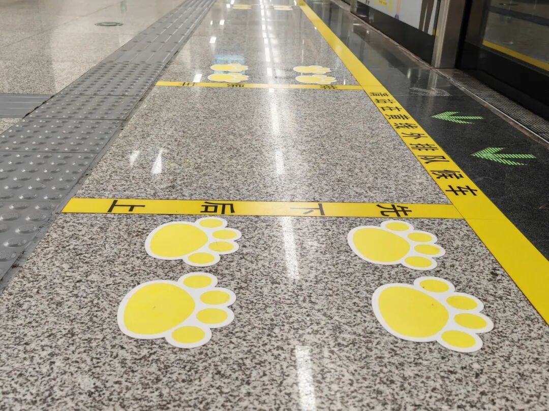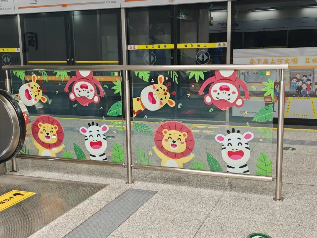 当您乘坐电扶梯到达站台后,扶梯尽头的栏杆玻璃上粘贴有长颈鹿、猴子、斑马、狮子等小动物,看他们在向您招手,仿佛在说“欢迎您乘坐郑州中建深铁3号线”,就连地上的卡通脚印也在招呼着您快来这里排队候车。
