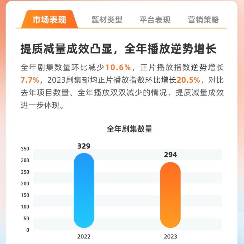 灯塔年度报告显示,2023年剧集数量294部,环比减少10.6%,但大盘正片总播放指数逆势增长7.7%,部均正片播放指数环比增长20.5%。