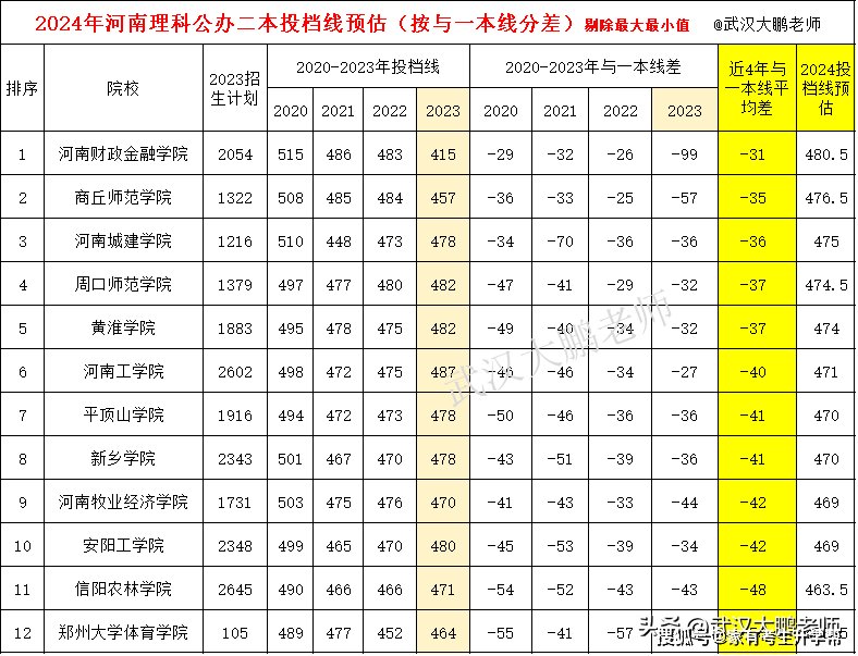 河南财政金融学院480分、商丘师范476分、周口师范学院475、河南城建学院474分、黄淮学院474分、平顶山学院470分、新乡学院470分、河南牧业经济学院469分、安阳工学院469分、信阳农林学院463分、郑州大学体育学院460分。这个分数线和位次预测法偏差不大。
