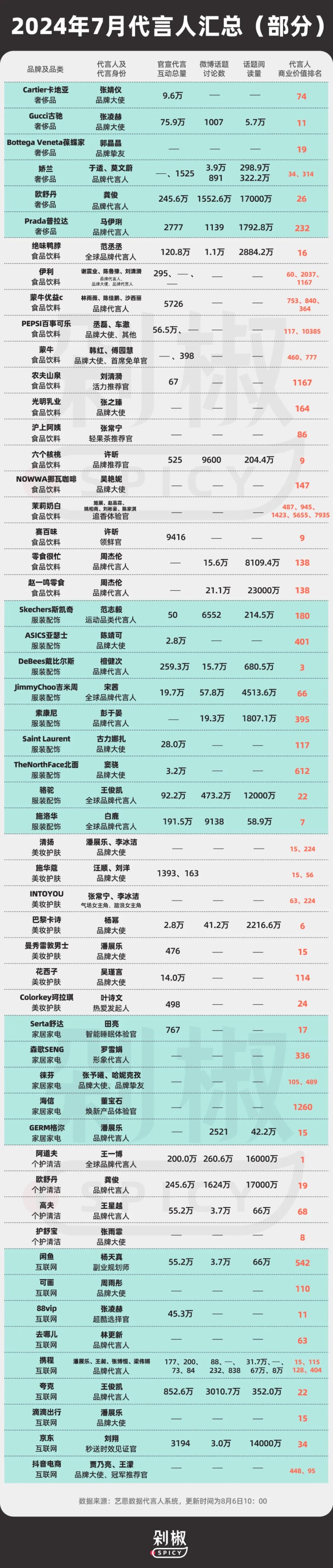 剁椒Spicy开辟《代言人月度辣评》栏目,与艺恩等数据平台,以及兰渡、赞意等领先的营销机构联手,盘点代言动向,提炼行业观点。
