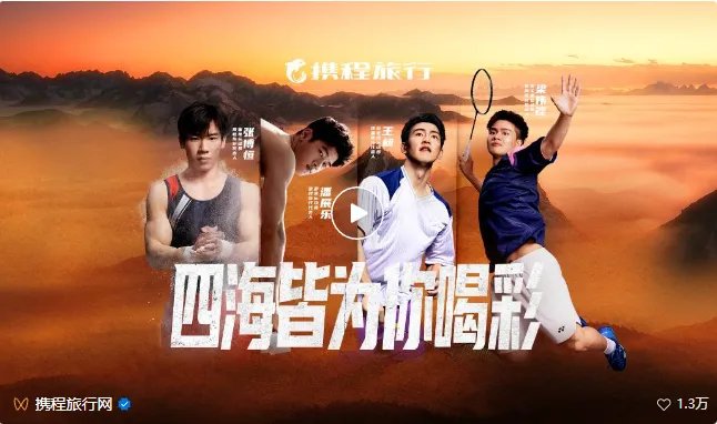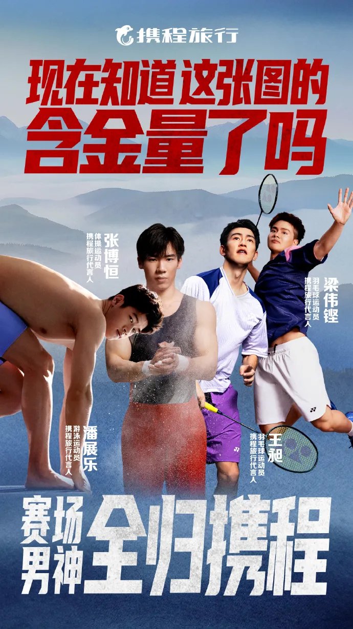 7月5日,携程官宣三组初登奥运赛场的00后夺冠热门选手成功成为品牌旅行代言人,游泳选手潘展乐、体操选手张博恒以及羽毛球队男子双打选手王昶和梁伟铿组成携程金牌男团,携程以一支「四海皆为你喝彩」的主题片迎接“运动男团”的出道。
