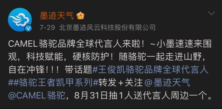 此外,CAMEL骆驼的跨圈层联动与传播策略进一步扩大了品牌的声量。从触达粉丝到深入粉圈,品牌采取了激励和游戏化的方式激发用户互动。例如,CAMEL骆驼联合@墨迹天气官博共同打造了带话题赢代言人签名照的活动,在增强了品牌的影响力外,极大地提升了用户的参与度和品牌忠诚度。