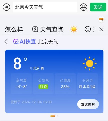 而如果你问的是有关天气、温度这样的搜狗已经提前内置模块的内容,还可以以图片的形式进行发送,算是一个还不错的小功能了。