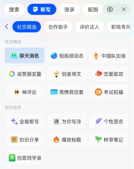 此外,在遇到一些类似于写好评、写评价等需要AI帮写的场景,也可以调用搜狗输入法的帮写功能,其中的聊天润色、朋友圈、神评论,都是一些可以用得上的功能。