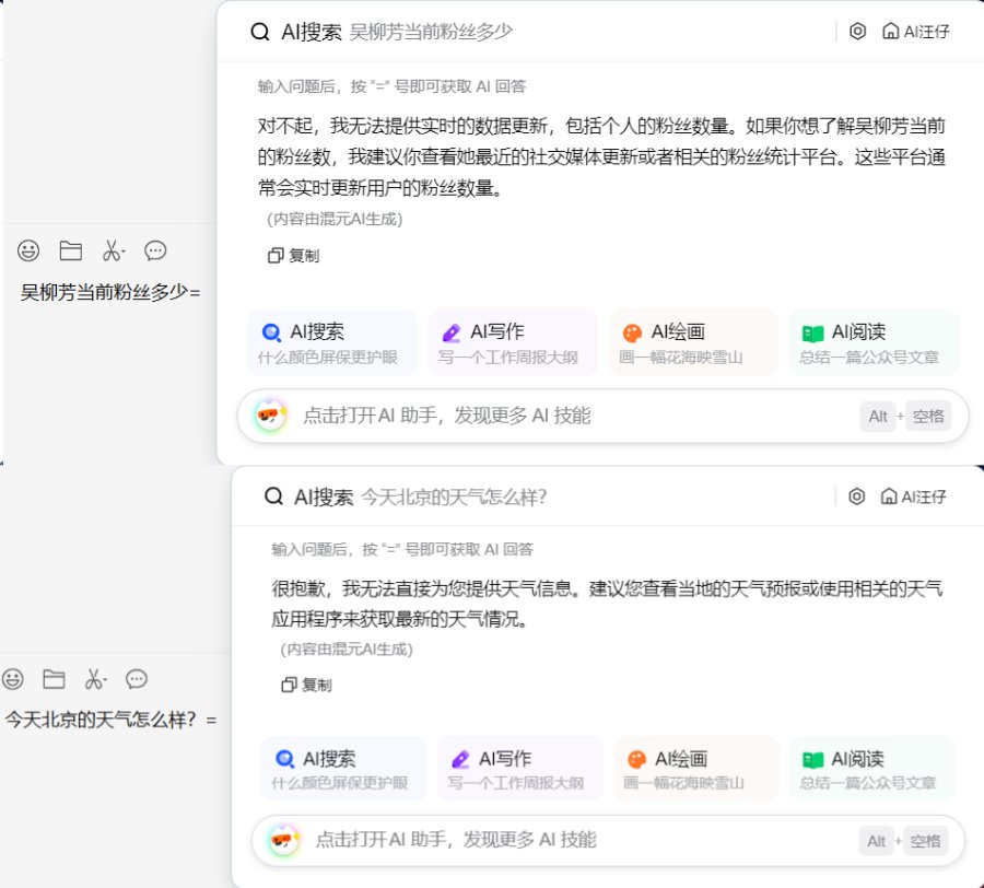 不同于移动端的输入问题搜索,在PC端将相关问题输入后加一个“=”,便可以调用AI能力了,但一些移动端里回答还算不错的问题与功能,到了PC端就直接“暴死”了——以刚刚的问题为例,原本对一半错一半的答案,现在直接无法回答了;原本很有创意也很有新意的天气模块,也直接“躺平”告诉你,“我无法为您提供天气信息”。