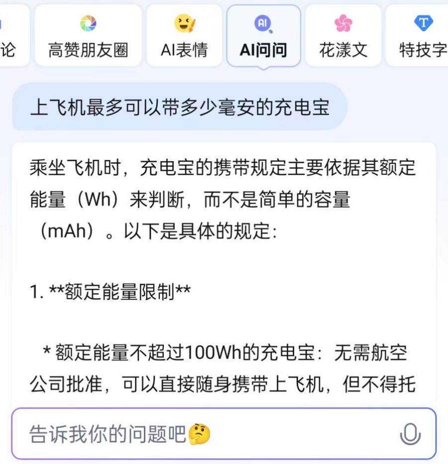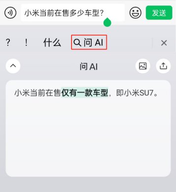 在这种猜测向的AI推送之外,在正常的输入问题之后微信输入法也会自动检测,并且给出一个“问AI”的选项,点击之后便可以完成一键AI问答;而事先点击问AI的效果,也完全相同。