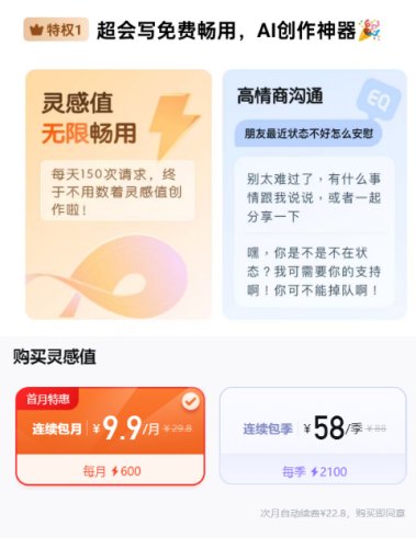而在充值上,移动端的权益和PC端的权益也有不同,同样是22.8元的包月价格,在移动端就可以每天使用150次的“超会写”功能,而PC端的600灵感值也只能支持总共200次的AI写作,后者可是一个月的时间啊,这种“歧视”性的购买政策,实在是有些割裂。