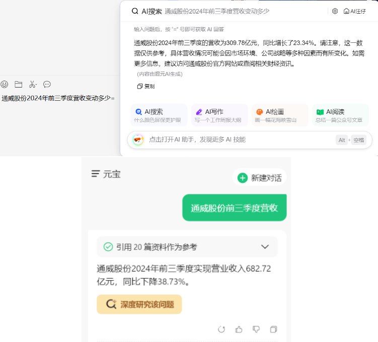更抽象的是,面对相同的问题,使用“=”调用AI搜索和进一步打开搜狗输入法进行AI搜索,竟然给出了一对一错不同的答案,而在经过我对比后发现,它们之间唯一不同的则是一个由混元AI生成,一个由元宝生成。这让我不禁感叹,既然都是腾讯的子公司,调用的也都是腾讯旗下大模型或大模型应用的能力,就不能对齐一下、把效果更好的那个给用户们“端”上来吗?