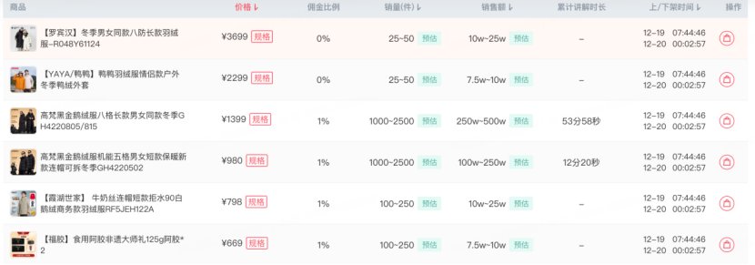 比如今年3月,董宇辉带货华为专场,一夜卖出超1亿元,其中售价6999元起的4000台Mate 60 Pro手机被抢购一空。12月以来,与辉同行直播间上线了多款价格不等的羽绒服,千元以上的如1399元的高梵黑金羽绒服、2299元的鸭鸭羽绒服、3699元的罗宾汉羽绒服。