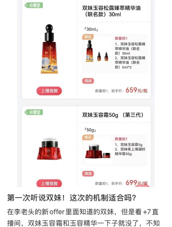 今年双11,李佳琦直播间首次上新上海家化旗下的高档品牌“双妹”,两瓶30ml的精华油售价为659元,两瓶50g的玉容霜售价为699元。
