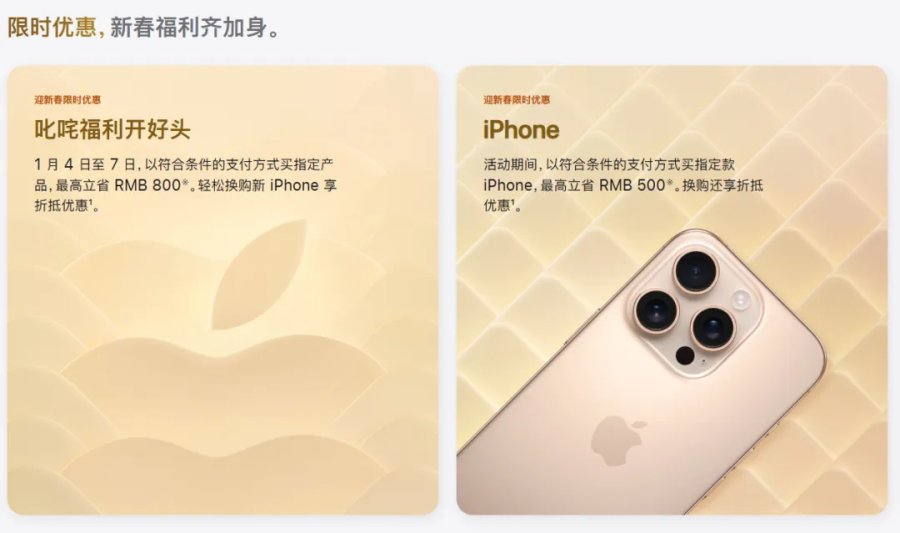 接着苹果就官宣了迎新春限时特惠,1月4日至7日,以符合条件的支付方式购买指定商品,最高立省800元。同时,如天猫平台针对iPhone 16 全系列提供200 元惊喜券,叠加后的优惠额度高至千元。