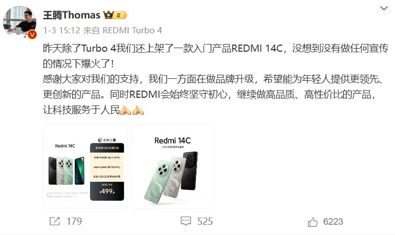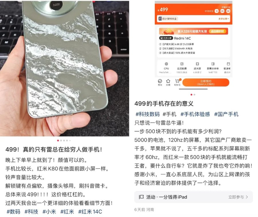 因此红米14C的出现,刷新了市场的认知,也炸出了广泛的受众群体。有网友说:“总有人买不起某些人口中不值一提的千元机,他们可以是留守儿童,可以是空巢老人,也可以是民工兄弟。对他们而言,手机只要能够打电话,能够使用微信、支付宝,再偶尔刷刷短视频就够了,哪怕卡顿一点也没关系,毕竟它只要499元。”