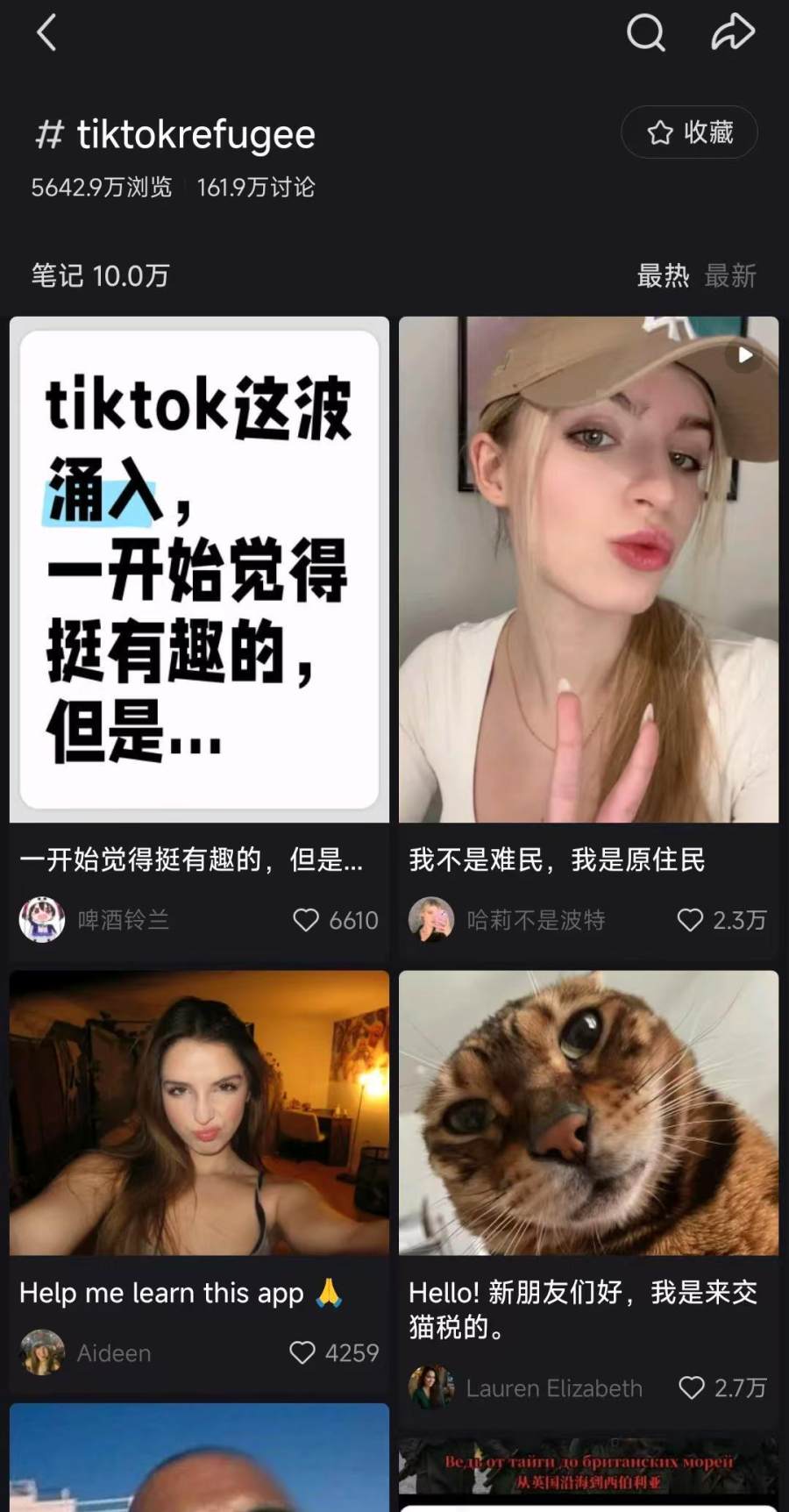 截至目前,在小红书内,“tiktok refugee”话题已经有了超过10万篇笔记,总浏览量超过5642万,同时讨论量超过161万,作为对比,在上午时,笔记数量还为7.7万篇,总浏览量为3858万,而在13日下午,该笔记数量才仅仅2000多条,总浏览量约为39万。
